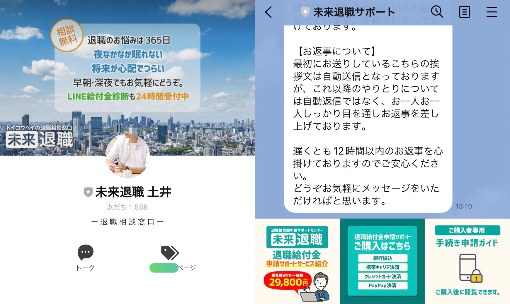 広告期間が終わるとこのサイト自体が見つけにくい状態になるので、少しでも興味のある方は、今このページを見れているうちに未来退職公式LINEからお友達追加をお願いします。
