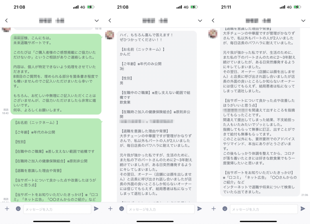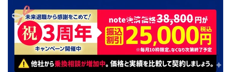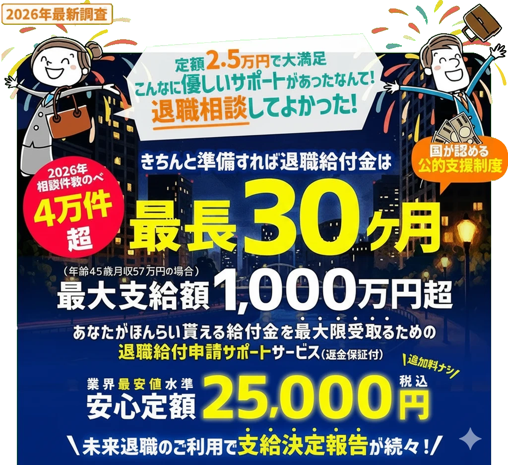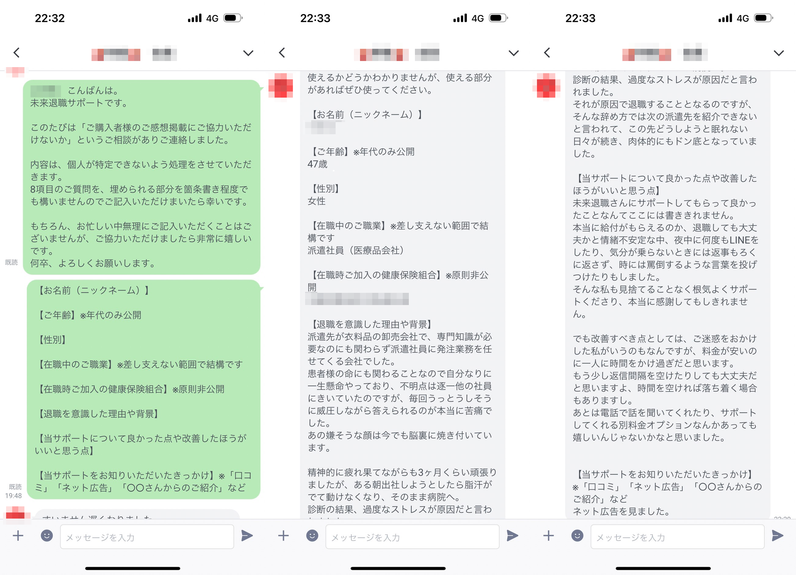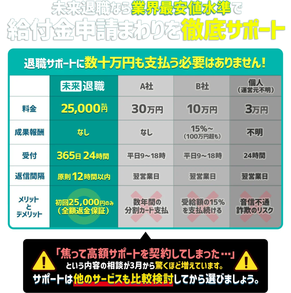 真っ当なサポートを提供されている同業他社様は共にこの社会問題に取り組む同志であり、未来退職以外をご利用されても、今の仕事で苦しんでいる方が長期療養と退職給付金で前向きな再スタートができさえすれば、私としてはこれ以上はありません。