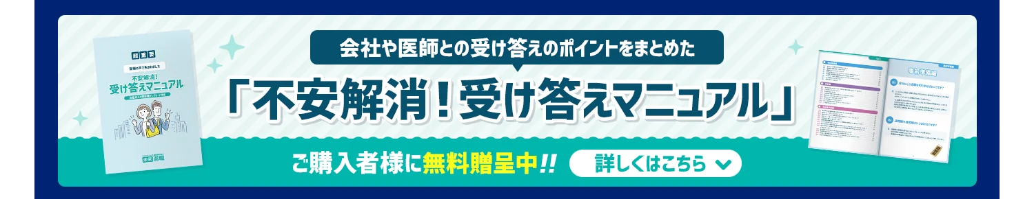 また、会社や医師との受け答えのポイントをまとめた「不安解消!受け答えマニュアル」もご用意しており、ダウンロードいただいた後、お手元のスマートフォンや印刷して冊子として、いつでもお手元で確認していただけます。