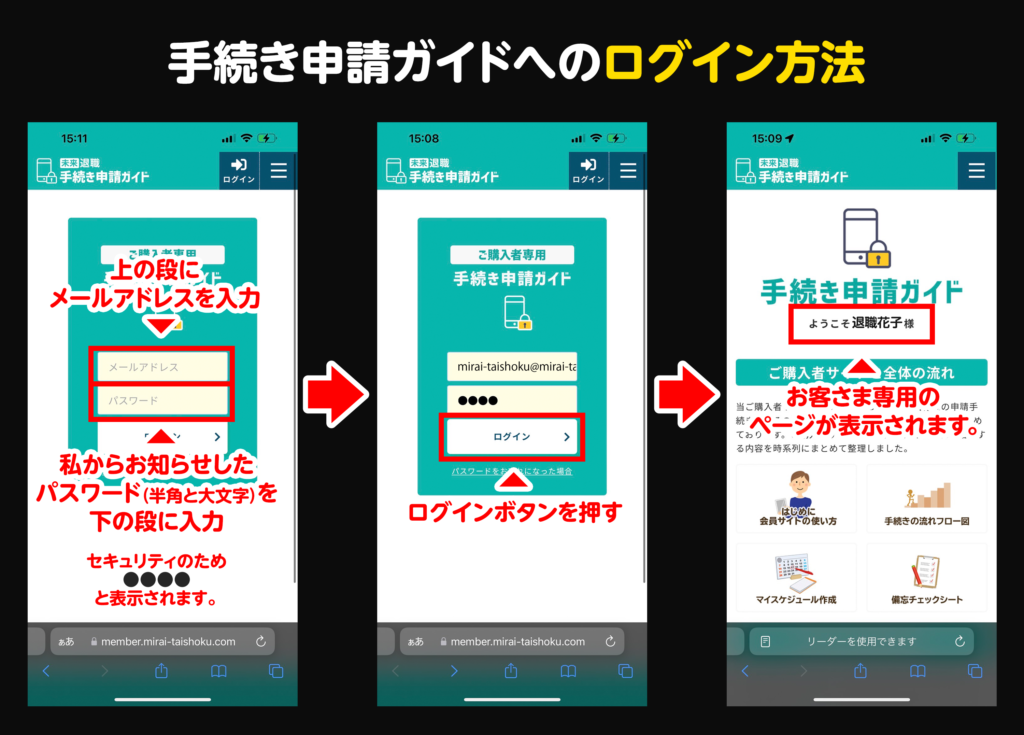 サポートのご購入後は、ご購入者様専用サイト「お手続き申請ガイド」にログインいただけるようになります。